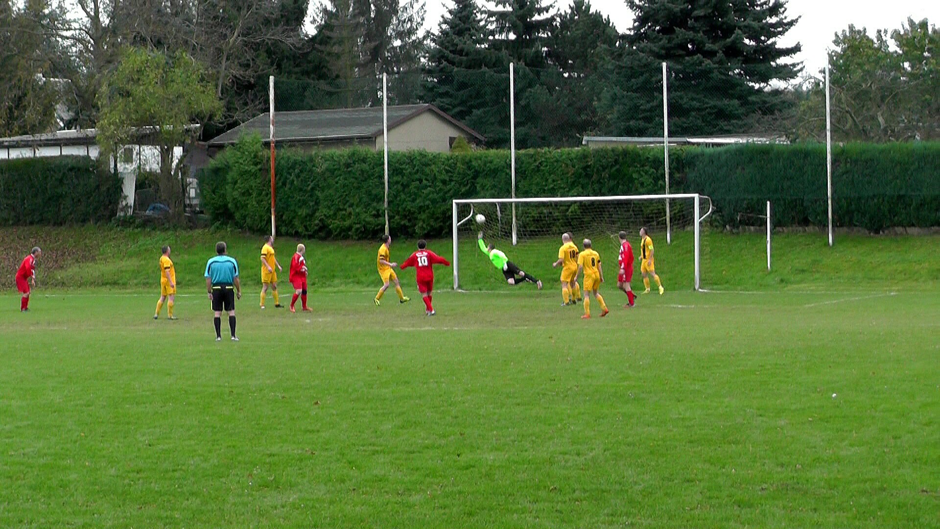 | Zum letzten Auswärtsspiel für diese Saison stand für unsere Jungs eine kurze Reise an den Röntgenweg zum Stadtrivalen Rot-Weiß Weißenfels an. Die Personaldecke sah doch nicht ganz so dramatisch aus, wie befürchtet, da auch zwei bereits verabschiedete Syrer extra zum Spiel nochmals anreisten. So standen dem Trainergespann Henze/Weiß 14 Akteure zur Verfügung. Bei sommerlichen Temperaturen erwischten die Schwarz-Gelben einen perfekten Start. Nach ca. 40 Sekunden führte Maik Weiß einen Freistoß schnell auf Knothe aus, der auf der rechten Seite Hofmeister in die Spur schickte. Dieser ging in den Strafraum bis zur Grundlinie und legte zurück auf Eldin Mulic, der zum frühen 0:1 einschob. Doch dieser frühe Treffer schien unserer Mannschaft nicht gutzutun. Man hörte nach wenigen Minuten auf Fußball zu spielen und stand viel zu weit von den Gegenspielern weg. So kam die Rot-Weiß-Reserve, die ebenfalls mit lediglich 12 Mann Personalprobleme hatte, zu den ersten Chancen. In der 13. Minute ging der starkaufspielende Mironi Ghebrezgabher Ghebregergis über die linke Seite gegen 3 WFV-Akteure durch, zog vom linken Strafraumeck ab und zirkelte den Ball zum 1:1 in den linken oberen Winkel. Die Gäste, weiterhin ohne Zugriff, kamen nicht mehr ins Spiel, sodass sich Alexander Schrei in der 21. Minute auf der rechten Seite bis in den Strafraum durchsetzte und aus kurzem Winkel das 2:1 erzielte. Die rot-weißen Hausherren waren in dieser Phase klar überlegen und dem 3:1 sogar näher als unsere Mannschaft am Ausgleich. So setzte Alexander Schrei einen Schuss an den rechten Pfosten. Nach 20 Minuten Sommerfußball besinn man sich wieder darauf im Wettkampfmodus zu agieren und schaffte prompt den Ausgleich. Nach einem langen Ball von Schotten-Lieberam war Christian Hofmeister schneller am Ball als RWW-Keeper Schirmer, ließ sich beim Zusammenstoß nicht fallen und drückte den Ball zum 2:2 über die Linie. Nur zwei Minuten später traf Knothe nach Doppelpass mit Guiga erst den Pfosten, ehe Guido Schotten-Lieberam den sogenannten zweiten Ball ca. 22 Meter vor dem Tor auf den Fuß bekam und diesen über den etwas zu weit vor dem Gehäuse stehenden Hüter zum 2:3 in die Maschen zirkelte. In der 35. Minute brachte Daniel Nürnberger einen Freistoß aus 53 Metern halblinker Position in Richtung 5-Meterraum. Dort irritierte Guiga den unglücklich agierenden Torhüter Schirmer so, dass Nürnbergers Ball vor ihm aufkam und über ihn weg im Rot-Weiß-Gehäuse landete. Die Hausherren waren komplett geschockt und ihrerseits nun komplett von der Rolle, sodass wiederum nur 4 Minuten später nach tollem Zuspiel von Knothe, Guido Schotten-Lieberam alleine aufs Tor zugehen konnte, den Hüter umkurvte und zum 2:5 einschob. Sinnbildlich für diese Spielphase war das 2:6 nur eine Minute später. Gleich 4 WFV-Akteure gingen nach Pass von Weiß auf den bemitleidenswerten Tim Schirmer zu, sodass Andreas Wolf nur quer legen brauchte auf Anis Guiga und dieser ins leere Tor einschob. Somit wurde das Spiel in diesen denkwürdigen 12 Minuten komplett auf den Kopf gestellt ging mit 2:6 in die Halbzeitpause. Die wieder zahlreich mitgereisten Fans fühlten sich gut unterhalten, mussten allerdings selber für die gastronomische Verköstigung sorgen, da der Kneiper der anliegenden Kegelbahn kein Interesse hatte Umsatz zu machen. Nach Wiederanpfiff sah das Spielgeschehen dann wieder eher nach Sommerfußball aus. Beiden Mannschaften gelang nicht viel, sodass das Spiel so vor sich hinplätscherte. Die besten Gelegenheiten hatten für den WFV hatten Andreas Wolf nach Ablage von Guiga und Anis Guiga selber nach Querpass von Hofmeister. Wolfs Schuss wurde aber in letzter Not abgeblockt und Guiga traf den Ball nicht optimal, sodass dieser rechts am Tor vorbei ging. In der 54. Minute bekamen die Hausherren aus 30 Metern einen Freistoß zugesprochen. Thomas Otto brachte den Ball mit Wucht in den Strafrau, wo er an Freund und Feind vorbei ins Tor ging. Leider aus WFV-Sicht auch an den Armen von Thomas Langrock, der sich da verschätzte und keine gute Figur machte – 3:6. In der 67. Minute war die Entfernung mit 45 Meter noch größer, doch Thomas Otto drosch erneut mit voller Wucht an das Leder. Der Ball wurde länger und länger und landete wieder im WFV-Gehäuse. Auch hier unterschätzte Langrock diesen Ball. Somit witterten die Hausherren nochmal Morgenluft und bäumten sich auf. Unsere Jungs brauchten wieder eine Weile, um den Schalter umzulegen. In Minute 74. Hätte erneut Thomas Otto per Kopfstoß fast das 5:6 erzielt, doch er traf nur den Querbalken. Der anschließende Nachschuss wurde glücklicherweise von einem rot-weißen Akteur abgewehrt. Somit hatte der WFV ordentlich Dusel in dieser Szene. Die Entscheidung folgte dann in der 80. Spielminute. Nachdem RWW-Hüter Schirmer einen Schuss von Schotten-Lieberam zunächst abklatschen lassen konnte, war der eingewechselte Mohamad Mossa zur Stelle und erzielte das 4:7. Der ordentlich leitende Schiedsrichter Werner pfiff letztendlich dieses unterhaltsame, aber sehr kuriose Derby ab. Ein Spiel, wo beide Torhüter keinen guten Tag erwischten und welches man so schnell nicht vergessen wird. Tabellarisch sicherte man sich durch den Sieg nun endgültig den 6. Platz und kann entspannt ins letzte Heimspiel nächsten Samstag gegen Baumersroda gehen!